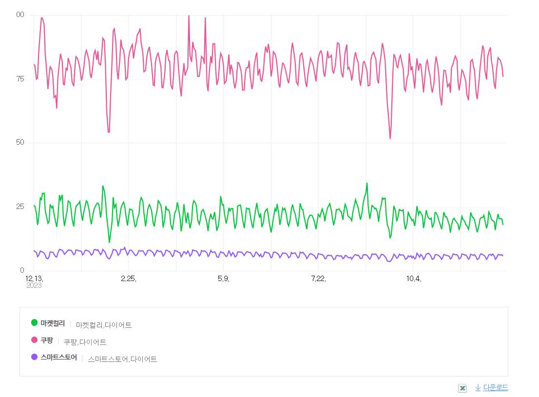 네이버 검색 데이터 조회를 눌렀을때, 압도적인 점유율로 쿠팡>마켓컬리>스마트스토어 순으로 형성이 되어 있는것을 확인 할 수 있습니다. 다만, 여기서 우리가 주목해야될 점은 스마트스토어는 네이버 검색창에 다이어트만 검색해도 쇼핑이 가능할 수 있기때문에