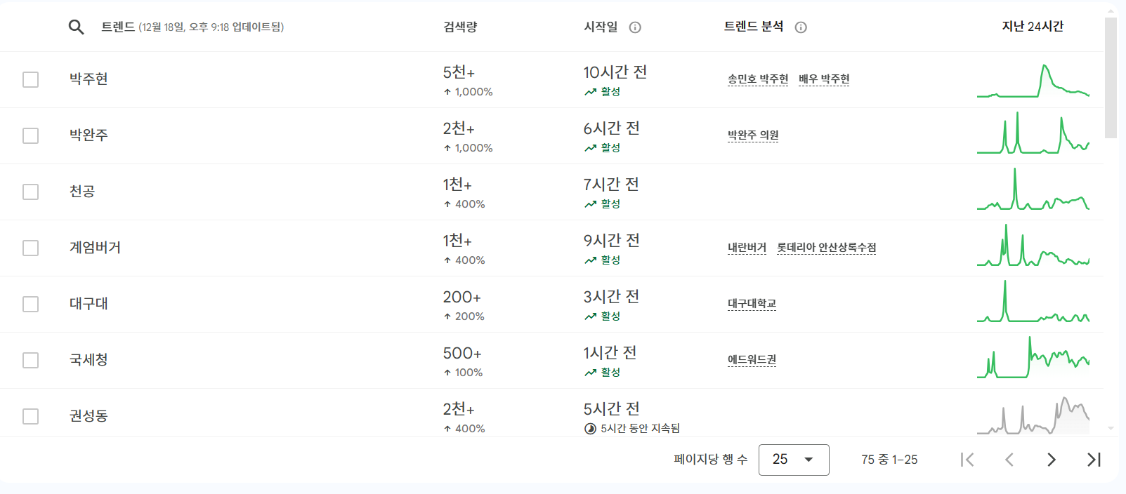 12/18 대한민국 구글 트렌드 분석 실시간 내용 입니다.