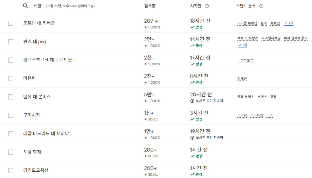 12/23 대한민국 구글 트렌드 분석 실시간 내용 입니다.